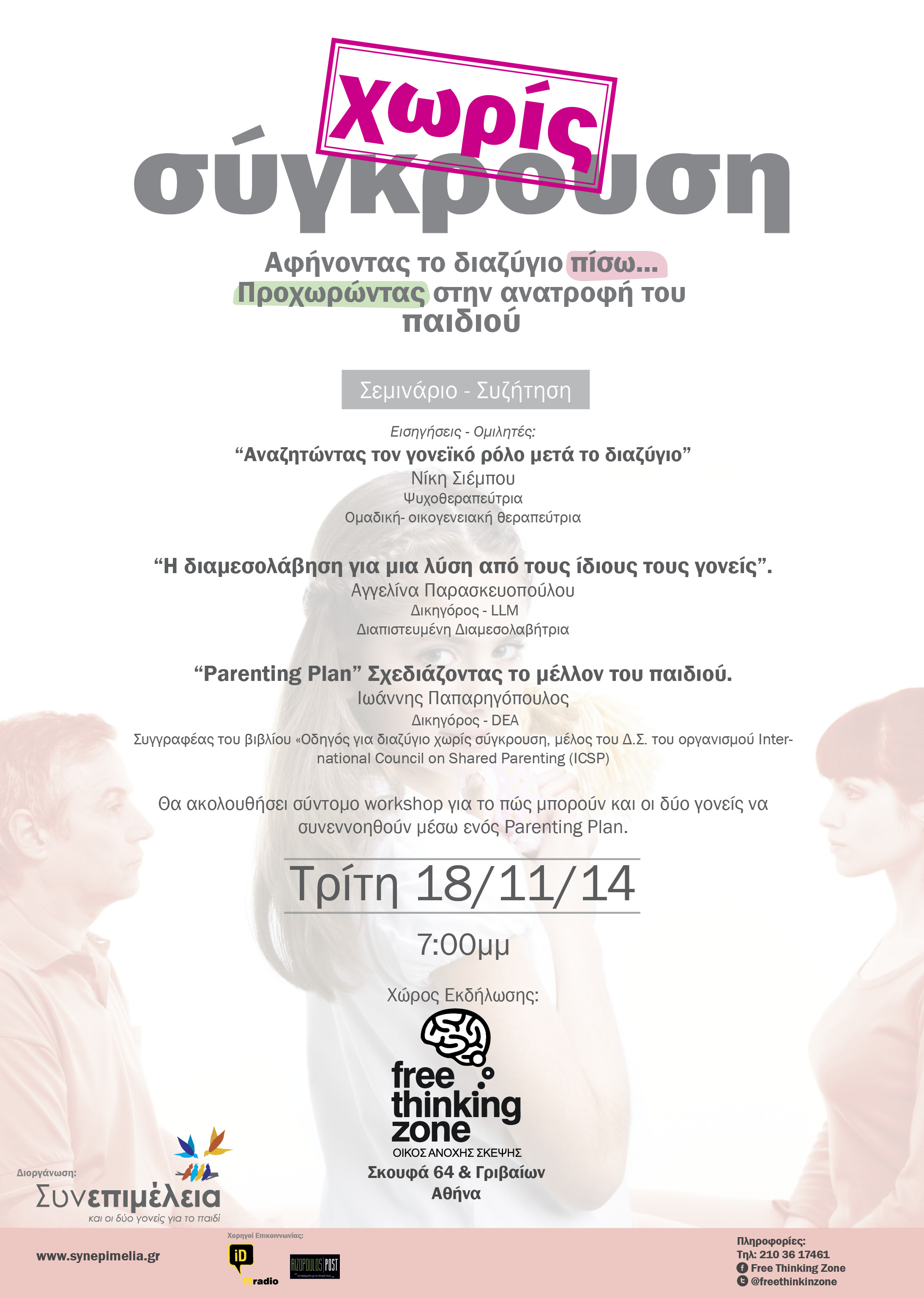 Το πώς είναι δυνατό να πραγματοποιηθούν τα παραπάνω, θα κληθούν να συζητήσουν τρεις ειδικοί, στο σεμινάριο που θα γίνει την Τρίτη 18/11 στο Concept βιβλιοπωλείο Free Thinking Zone, ενώ θα ακολουθήσει συζήτηση και workshop στο οποίο θα επιδειχθεί πως μπορεί στην πράξη να υλοποιηθεί ένα Parenting Plan.