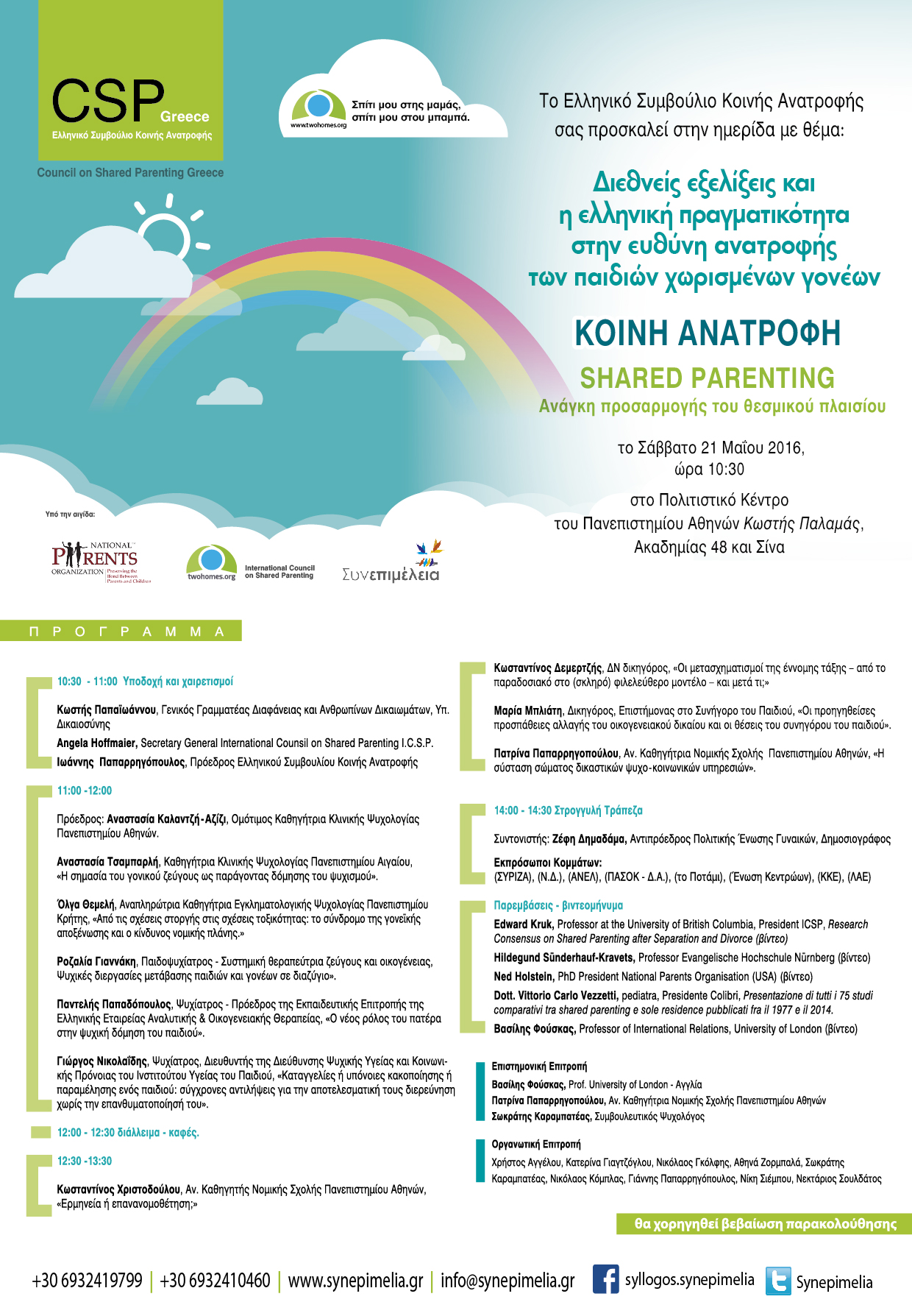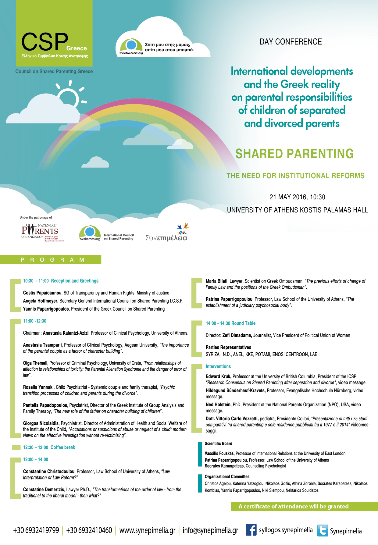 On Saturday May 21st of 2016 for the first time in Athens was held an especially important kick off Day Conference with subject “International developments and the Greek reality on the parenting responsibilities of children of separated and divorced parents”.