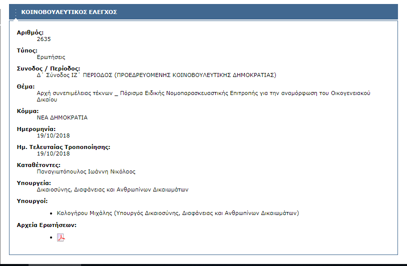 Ο βουλευτής κ. Ν. Παναγιωτόπουλος κατέθεσε ερώτηση προς τον Υπουργό Δικαιοσύνης για την πορεία και το έργο της Νομοπαρασκευαστικής Επιτροπής.