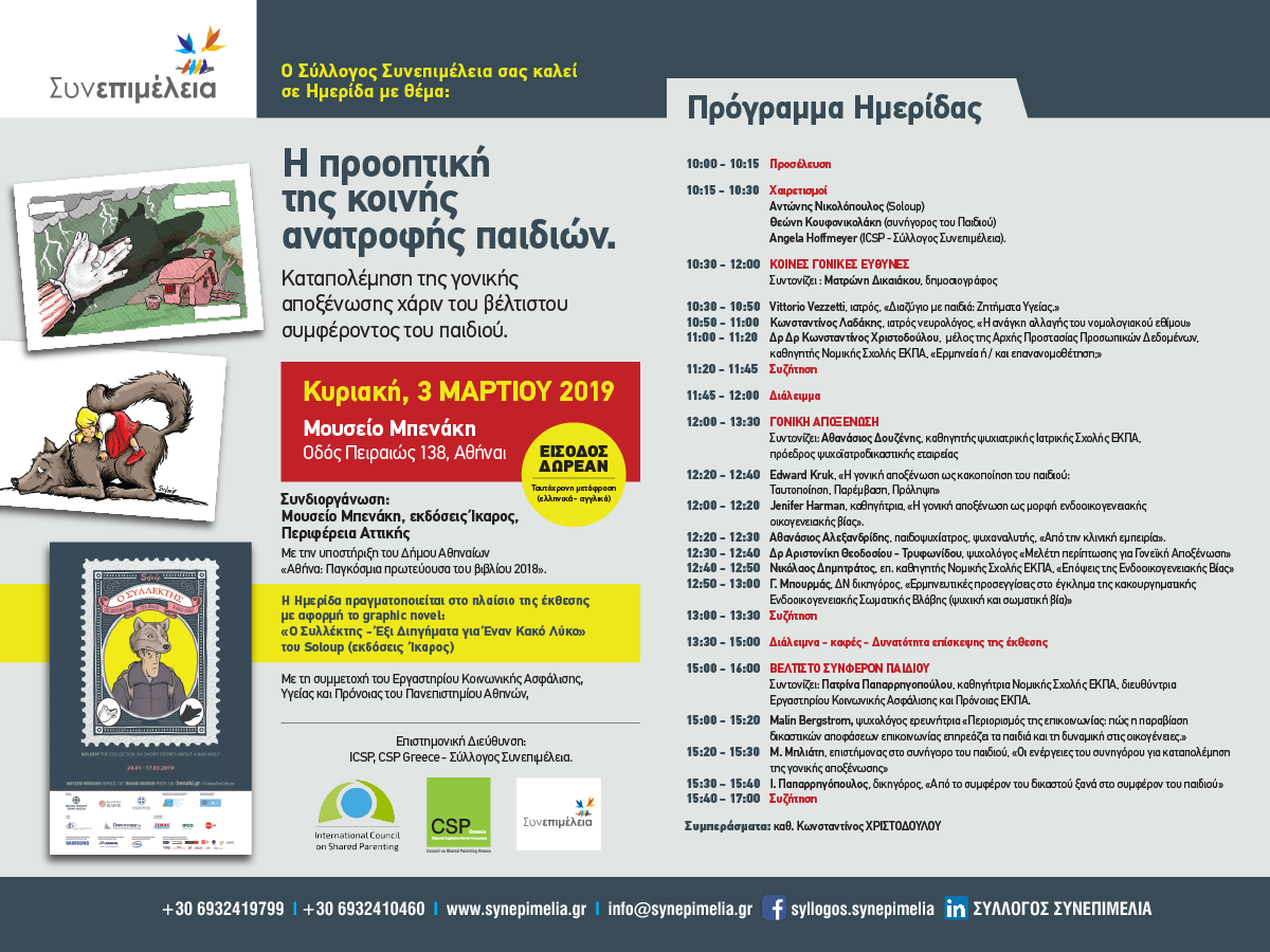 Την Κυριακή 3 Μαρτίου 2019 για πρώτη φορά στην Ελλάδα διοργανώνεται ημερίδα κατά της γονικής αποξένωσης. Συνδιοργανώνεται από το Μουσείο Μπενάκη και άλλους φορείς στα πλαίσια της έκθεσης για το novel comic «Ο Συλέκτης. Έξι ιστορίες για ένα κακό λύκο» βιβλίο». Το ICSP και ο Σύλλογος Συνεπιμελεια έχουν αναλάβει την επιστημονική διεύθυνση της ημερίδας.