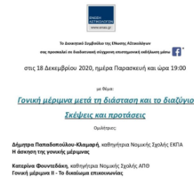 Στις 18 Δεκεμβρίου 2020 διοργανώθηκε διαδικτυακή ημερίδα από την ένωση αστικολόγων με θέμα τη Γονική Μέριμνα.